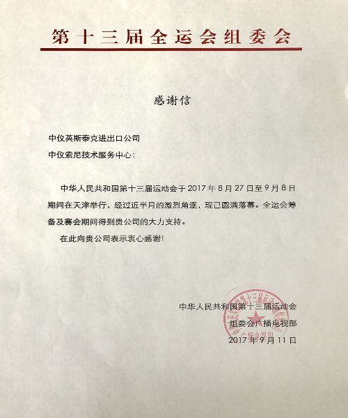第十三屆全運會組委會向英斯泰克公司發(fā)來感謝信