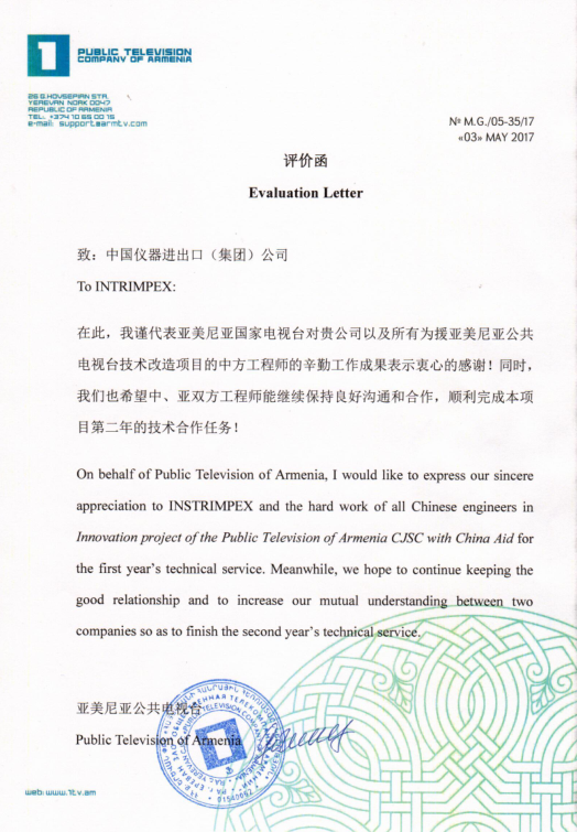 日前,中儀公司收到亞美尼亞公共電視臺發(fā)來的評價函,高度評價中儀公司在執(zhí)行中國援亞美尼亞公共電視臺技術改造項目過程中提供的先進的轉播車和播出系統(tǒng)、優(yōu)質的技術合作服務以及團隊合作奉獻精神。中儀公司將繼續(xù)秉承我國對外援助的宗旨...