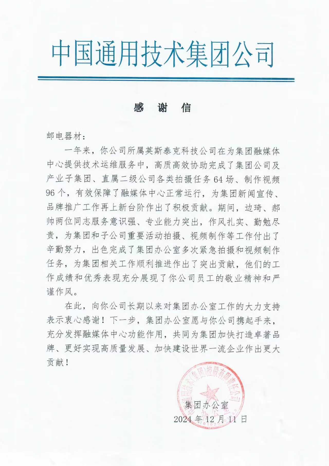 通用技術(shù)集團辦公室向通用技術(shù)集團郵電器材英斯泰克公司發(fā)來感謝信